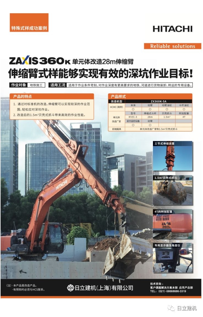 為滿(mǎn)足這一需求,日立建機推出了專(zhuān)業(yè)性更強的伸縮臂挖掘機,通過(guò)伸縮型工作裝置,可以達到28-30米的垂直作業(yè)深度。1.5立方的貝殼斗可以大大增加機器的作業(yè)效率。同時(shí),在機器上加裝了攝像頭及角度儀等輔助設備,進(jìn)一步提升作業(yè)效率及安全性。
